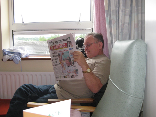 I spent six days in the Sligo General ortho ward working toward being able to be mobile enough to make the seven hour plane trip home to New Jersey. My husband kept vigil with me most of each day and the ladies in my ward quickly adopted him. He retrieved cell phones out of reach and found missing slippers for them in between sitting next to me reading the Irish newspapers.