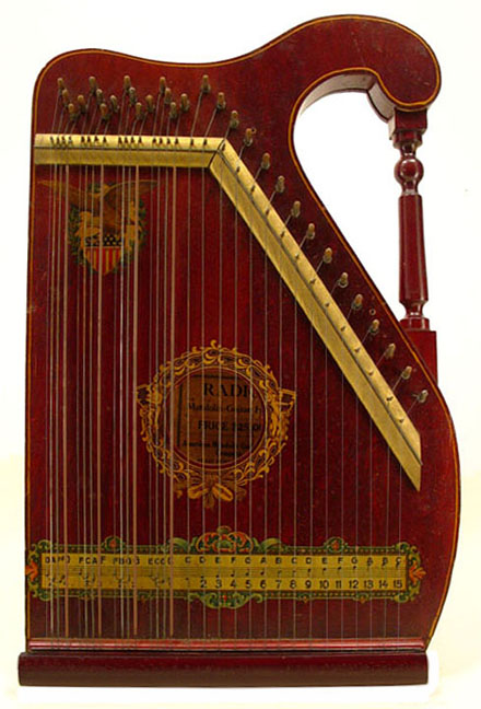 A zither is a stringed instrument dating to before the birth of Christ. Sometimes mistakenly referred to as an autoharp (a similar but distinct instrument), a zither may be played laid on a flat surface or propped in the player’s lap and may have as few as a dozen strings or as many as 50, depending on the specific type. Zithers enjoyed a wave of popularity in the late 1800s and early 1900s and were found in many homes where they were used for parlor entertainment. A premier maker of zithers at that time was Oscar Schmidt, a German-born immigrant who formed a music publishing company in New Jersey in about 1879.
